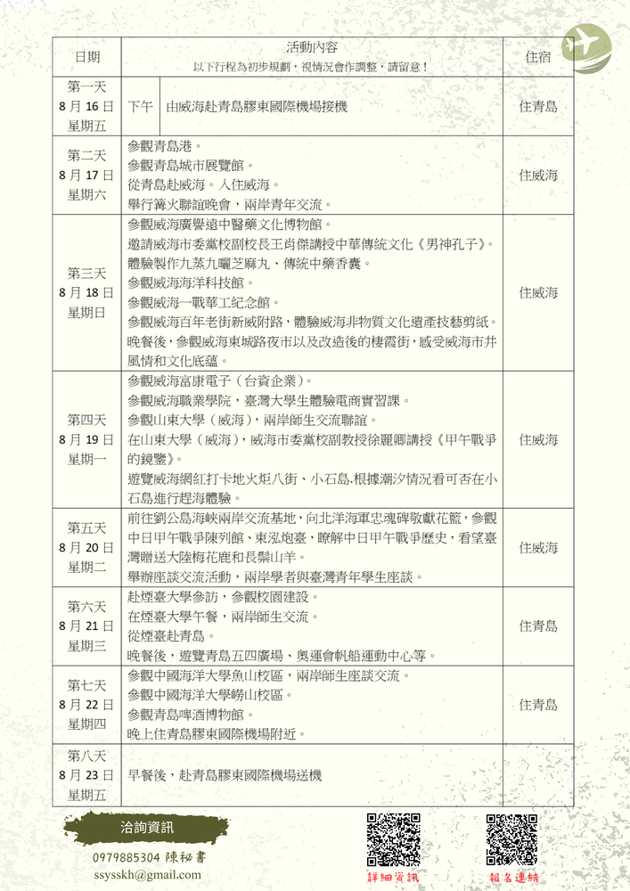 參觀威海富康電子(台資企業)。 參觀威海職業學院,臺灣大學生體驗電商實習課。 參觀山東大學(威海),兩岸師生交流聯誼。 在山東大學(威海),威海市委黨校副教授徐麗卿講授《甲午戰爭的鏡鑒》。 遊覽威海網紅打卡地火炬八街、小石島.根據潮汐情況看可否在小石島進行趕海體驗。 |